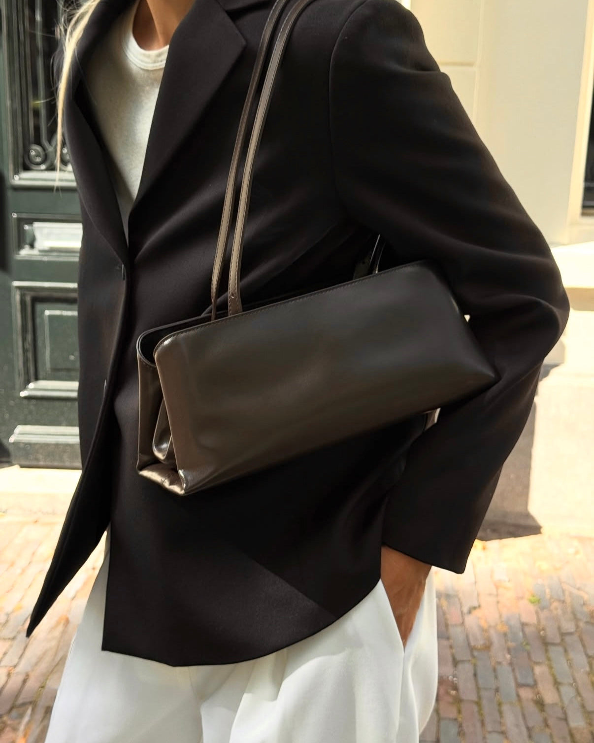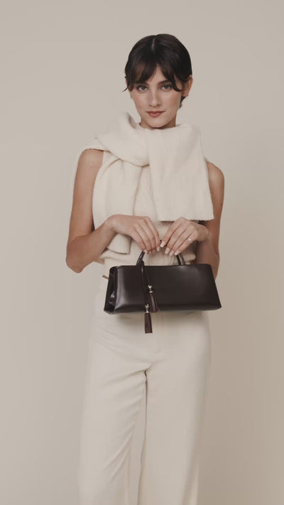 This chocolate leather clutch bag for women transitions seamlessly from day to evening with 2 sets of removable straps, allowing you to carry it as either a sophisticated shoulder bag, a top-handle bag, or a sleek clutch. The structured silhouette features a refined frame closure with metallic hardware, creating a timeless aesthetic.